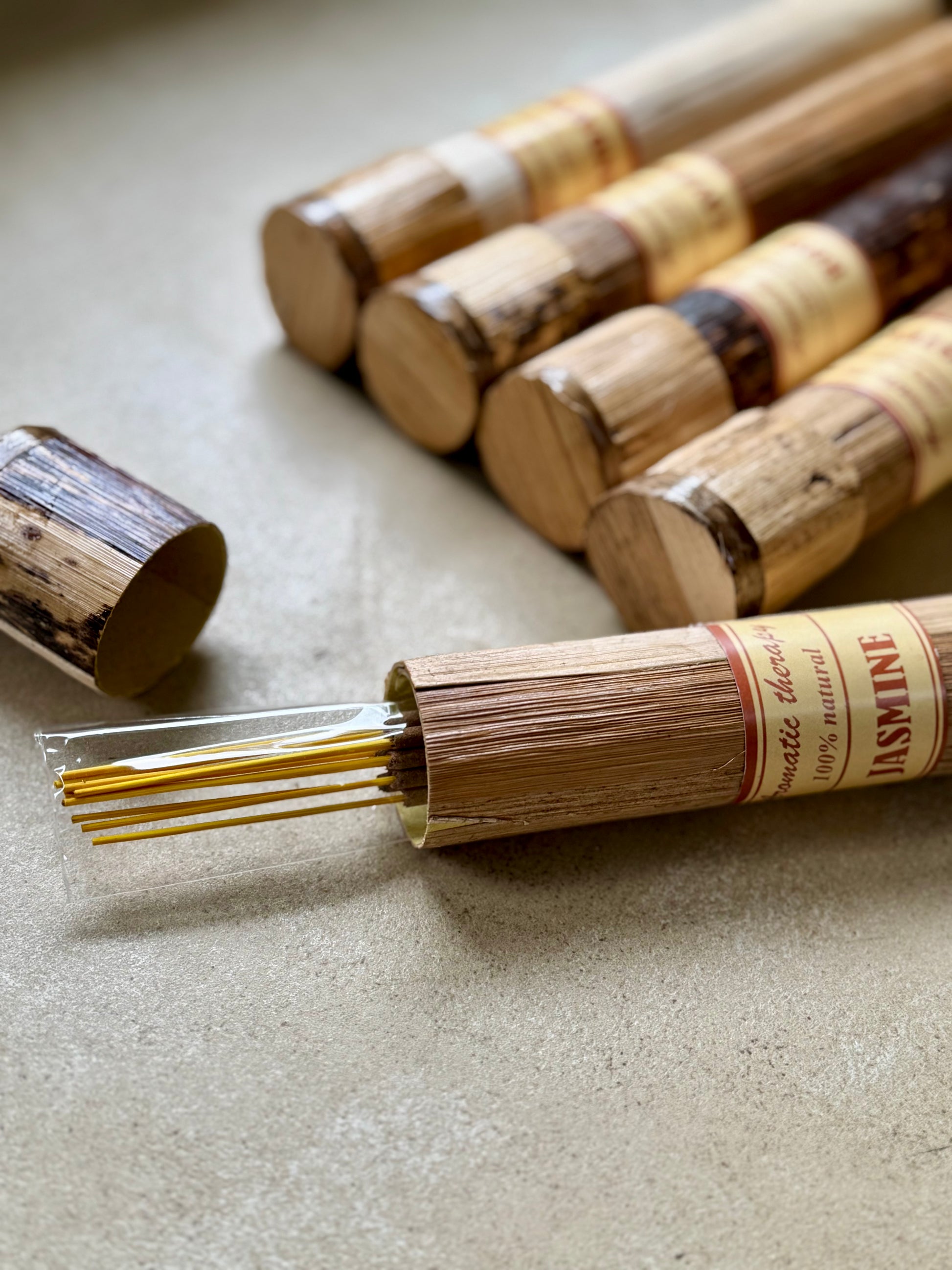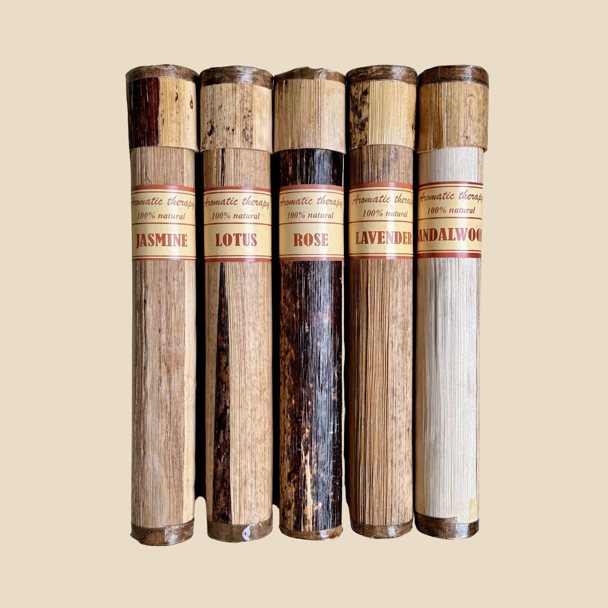 De set bevat 50 wierookstokjes, verdeeld over 5 handgemaakte kokers van bananenblad met 10 stuks van iedere geur: Sandalwood, Lavender, Rose, Lotus en Jasmine.